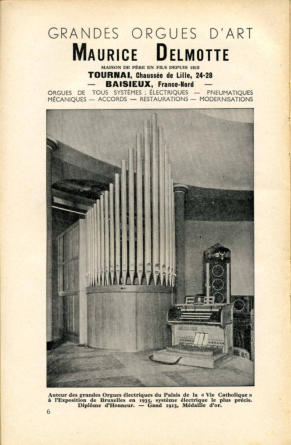 The Maison Delmotte: a long family tradition of organ builders passed from father to son. In 1812, Pierre-Fidèle Delmotte (1792-1867), watchmaker as his father, and then organist, created his own firm at Saint-Léger Hainaut, Belgium. He joined for a decade with his brother. His son Théophile (1833-1909) went to work with his older brother Constantin in the Studio in Saint-Léger, from 1855 until 1871. Théophile went to Paris in 1855 to learn at the Cavaillé-Coll workshop. He started a new workshop in Tournai, Belgium, in 1872, along with another brother, Edouard. Upon the death of the latter in 1899, Théophile directed the company on his own and in 1903, he took his son Maurice in the company. When Théophile died in 1909, Maurice was the only manager until he was succeeded by his own 21-year-old son Georges in 1946. Maurice Delmotte (1885-1961) showed an intense activity in the field of the electric traction and built the monumental organ (110 stops) at the National Institute of broadcasting (I.N.R.) in Ixelles (Brussels) in 1940. After the unexpected death of Georges, the family tradition was continued by two of his nephews, Guy Seghers and Denys Delporte. The son of George, Etienne Delmotte, became the general manager of the company. They now build organs using all transmission systems (mechanical, electrical, pneumatic or electronic). The work list of the Delmottes company mentions the construction of approximately 150 new organs and 100 major works and restorations.More information on Delmotte here (in French). There is one organ of Delmotte in Paris, at Saint-André-de-l’Europe.