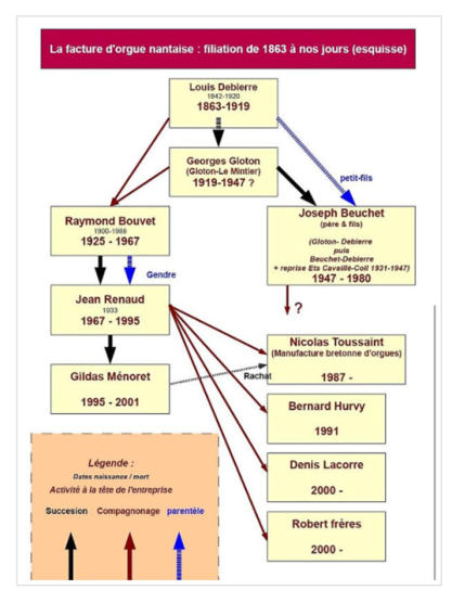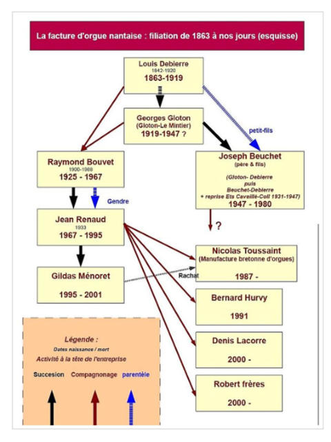 LouisFrançoisDebierre(1842-1920),sonofa cabinetmakerofNantes,wasapprenticeatseveralorgan- andharmoniumbuildersinParis(e.g.Debain)before returningtoNantesandsettinguphisownbusiness.While hebuiltsomefinethree-manualinstrumentsofaround50 stops,heisbestknownforhispatentedportableorgans, whichhebegantomakein1871.In1882,hegotapatent fortheinventionoforganpipes‘ofmultiplenotes’.He namedthisorgan‘orgueportatifàtuyauxpolyphones’and sold it around the world. InParis,theChapelledesmissionsétrangèresandthe cryptedel’égliseSaintHonoréd'Eylauhouseapolyphone. Healsoobtainedapatentforelectro-pneumaticactionin 1888. Debierreretiredin1919andsoldhisbusinesstoGeorges Gloton(1876-1955),anorganbuilderfromBourgogne,who learnedhisskillsattheworkshopofCavaillé-Coll.Gloton followedthetraditionsetbyDebierre,togetherwithhis associateLeMintier;thenameofthefirmwasthen changed to Gloton-Le Mintier. Beingchildless,heformedtheyoungJosephBeuchet (1904-1970),grandsonofLouisDebierre,whobecameone ofthedirectorsoftheHouseCavaillé-Collin1931.In1934, Gloton-LeMintieropenedabranchinParisinwhichJoseph Beuchettookthelead.In1947,JosephBeuchetbecame headofthecompany,nownamedBeuchet-Debierre,with amongothersEugènePicaudandJeanPerrouxas employees.Eugène’ssonJacquesPicaudbecamethehead oftheParisbranch,togetherJacquesBarbéris.Joseph Beuchetdiedin1970andhisson,namedalsoJoseph, became head of the company until its closure in 1980. The firm played a leading role in the XXth century Parisian organ landscape, in particular with regard to restorations of major Parisian organs. The number of new organs built by this firm is relatively small. The Danion-Gonzalez firm was their main competitor. TheBeuchet-Debierrefirmhasbeencontinuedafterits closure by former employees:Jacques Picaud Jacques Barbéris François Sebire Olivier Glandaz Marc Hedelin Louis Eugène Rochesson