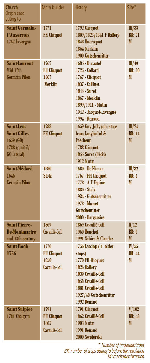 The table summarizes the main characteristics of the seven organs from before the revolution which have been restored in the 19th century and which have not been substantially modified in the 20th century. With the exception of the organ of Saint-Médard (which is basically a Stoltz-organ) and the organ of Saint-Pierre-de-Montmartre (no stops at all from before the revolution), the percentage of old stops is 50% or more for all organs.