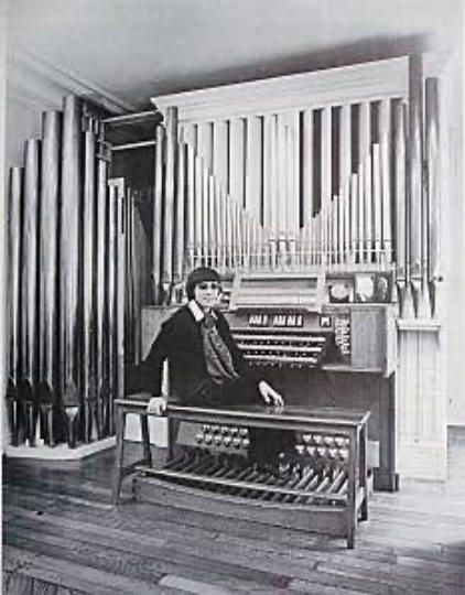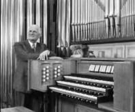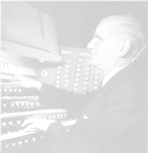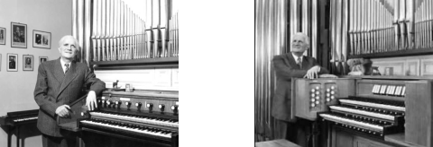 The organ at rue Duroc in Paris was originally meant to be an instrument for daily practice: two manuals and pedal, built by Gütschenritter. As years went by, my father’s repertoire increased, as did his ambitions and the number of friends who came to hear him. Thus, Marchal had a three-manual concert organ built in his studio. This expansion was achieved gradually, each step coinciding with his return home after international tours.In 1934, the pedal action was replaced by an electric one, allowing with the addition of 24 pipes the extension of the soubasse to 32′ acoustical, 16′, 8′, 4′, and 2′. After the end of World War II, Victor Gonzalez took over and some modifications that were reflective of the aesthetics of Marchal and Gonzalez took place. In 1954, the Marchals enlarged the studio and the organ, original chests and tracker action were preserved and a third manual, an unenclosed Positif, was added, the manual placed underneath the Great and connected to its chest by electric action. On that occasion, the organ was named “Phillipe-Emmanuel”.SourceThe photos are of Marchal at his house organ, before and after the enlargement in the 1950s.